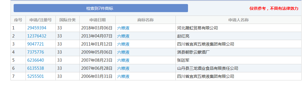 前兩天,邊肖在中國商標(biāo)局官網(wǎng)查詢。結(jié)果她驚喜地發(fā)現(xiàn)“六糧液”,而且已經(jīng)進(jìn)入初審公告期。在查詢33種白酒商標(biāo)時(shí),檢索到以下7條信息,均注冊(cè)為“六糧液”商標(biāo)。只有兩條信息顯示“六糧液”商標(biāo)的申請(qǐng)人為五糧液集團(tuán),其余均為他人申請(qǐng)。
